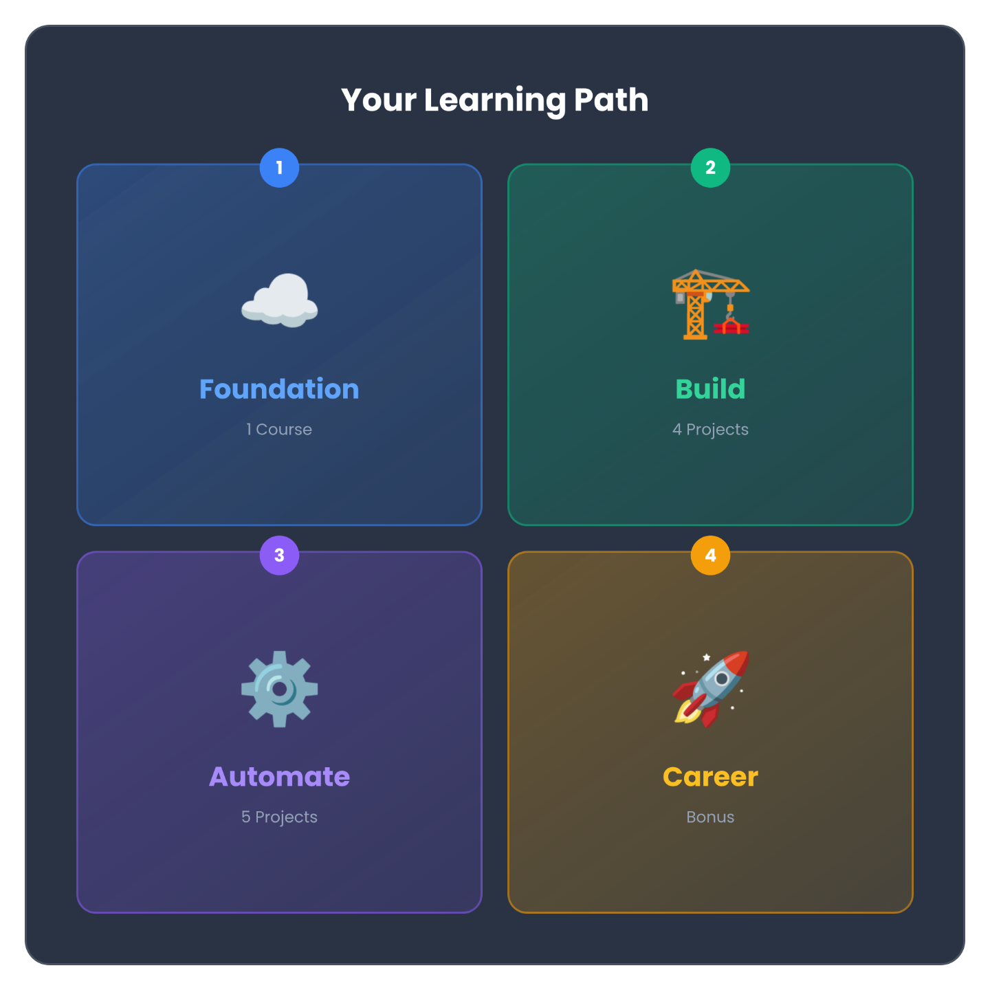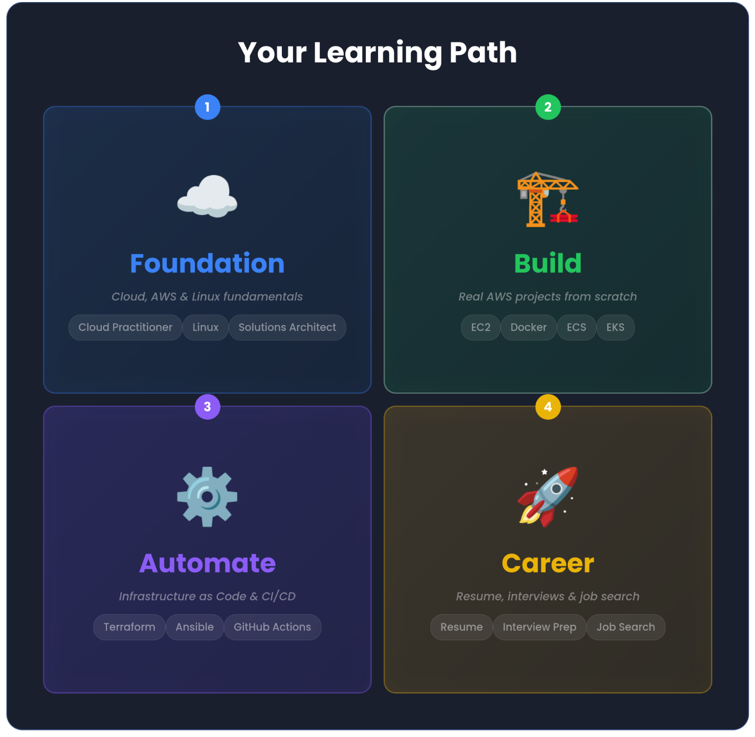 A structured, beginner-friendly system that takes you from zero cloud knowledge to real AWS & DevOps skills using certifications, hands-on projects, and automation — without guesswork.